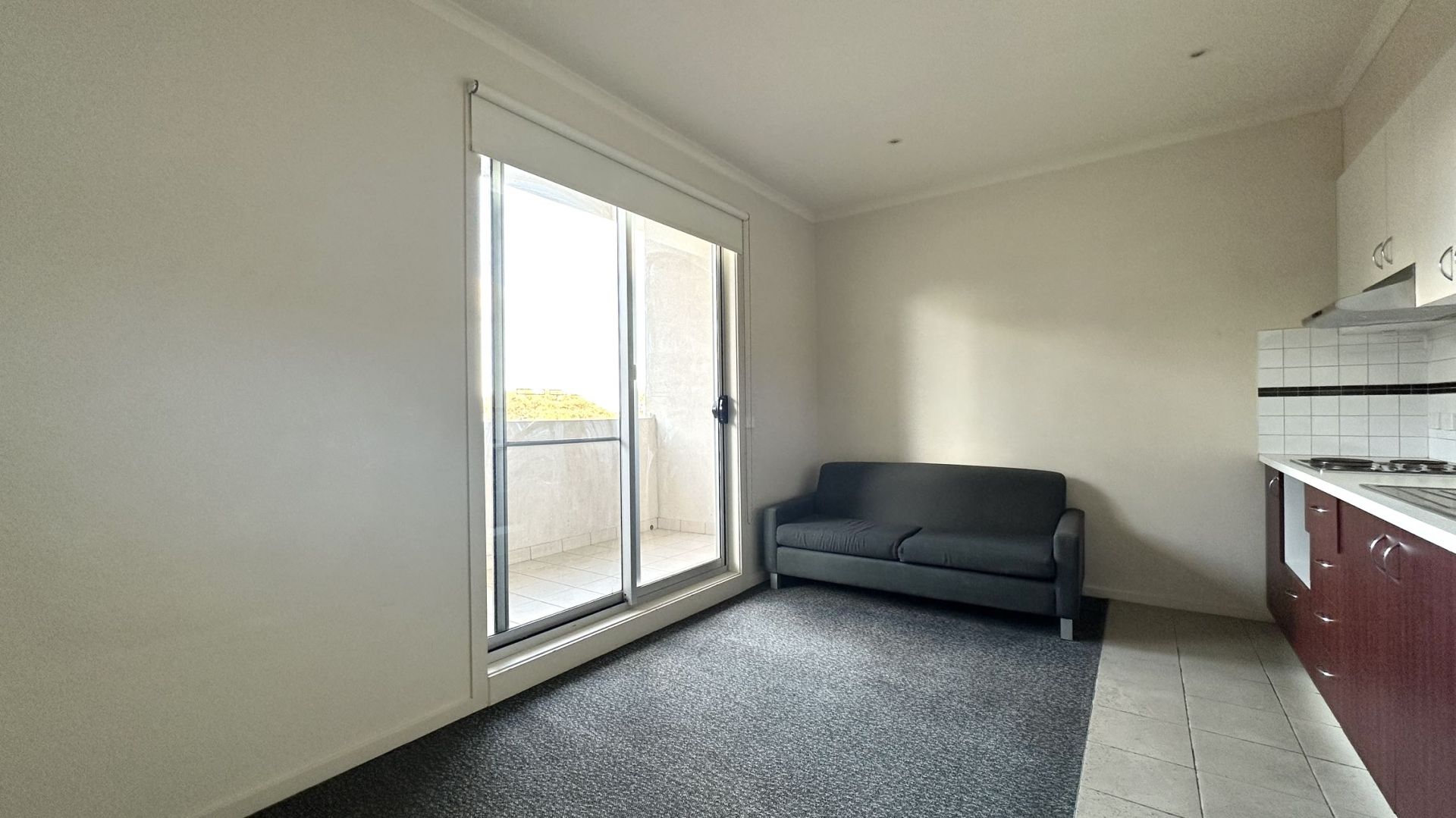 Apartment 139 is furnished and features open plan kitchen and living area with an external balcony, one bedroom with BIR and window, and a bathroom with shower.