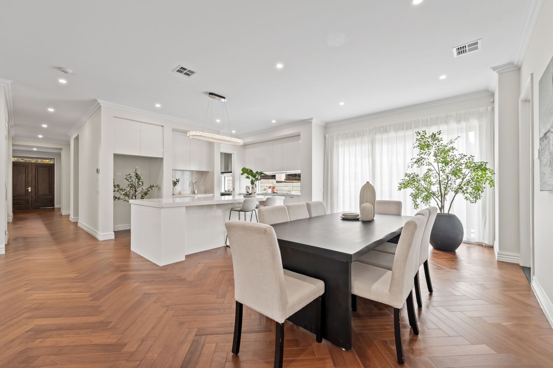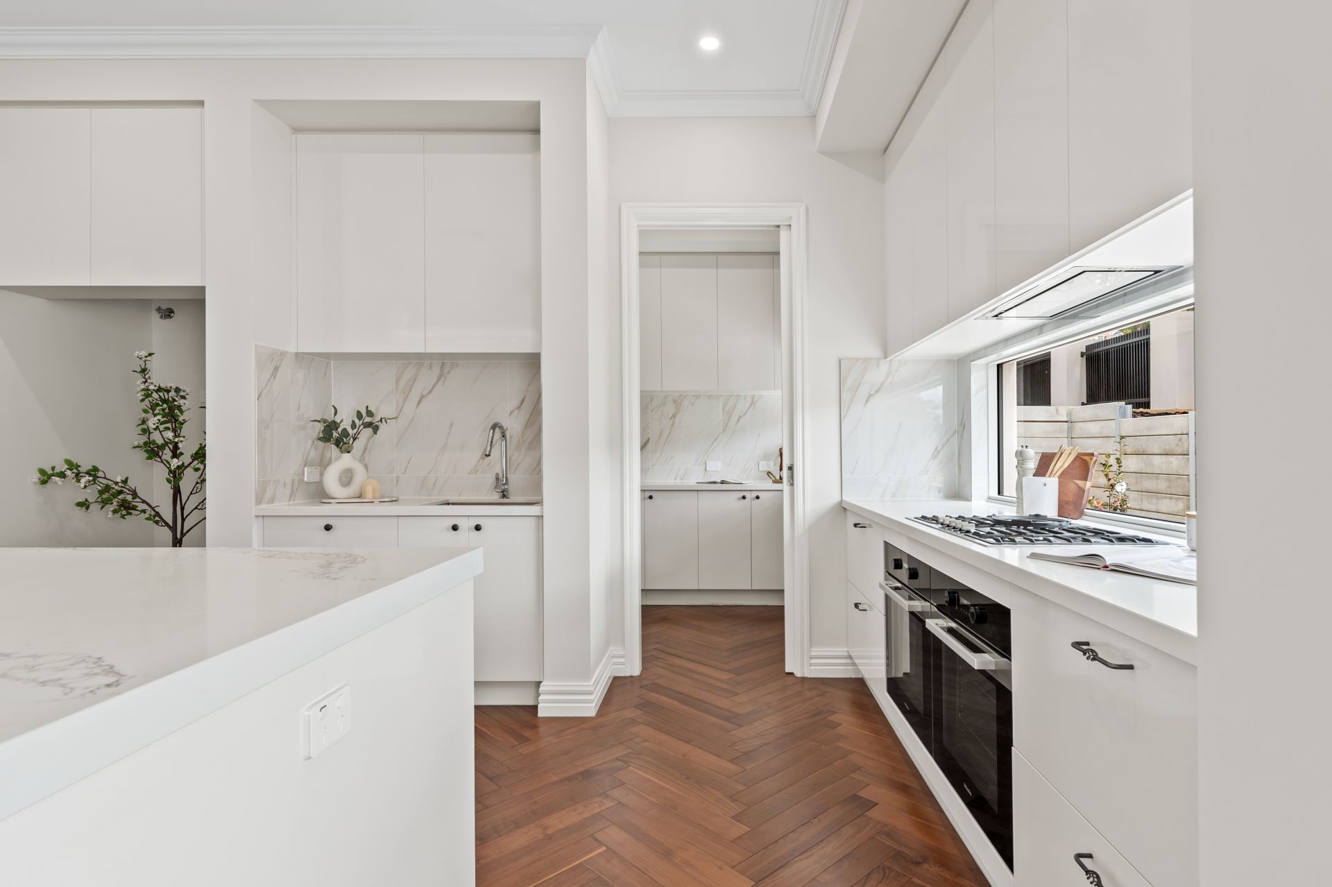 The gourmet kitchen showcases stone benches, window splashbacks, Miele appliances (dual ovens and gas cooktop), integrated dishwasher, island breakfast bench plus a 2nd kitchen and walk-in pantry, while outside, the alfresco presents the ideal setting for BBQs on balmy summer evenings, accompanied by low-maintenance surrounds.