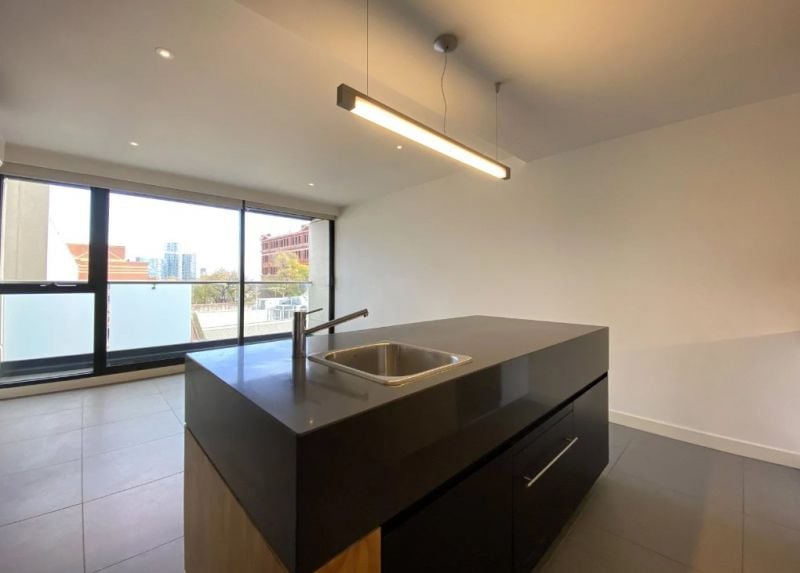 Apartment boasts generous living and dining area, sleek kitchen equipped with premium European stainless steel appliances, island bench with black stone benchtop, a light-filled double bedroom with BIRs, and a fully-tiled stylish bathroom with big walk-in shower.