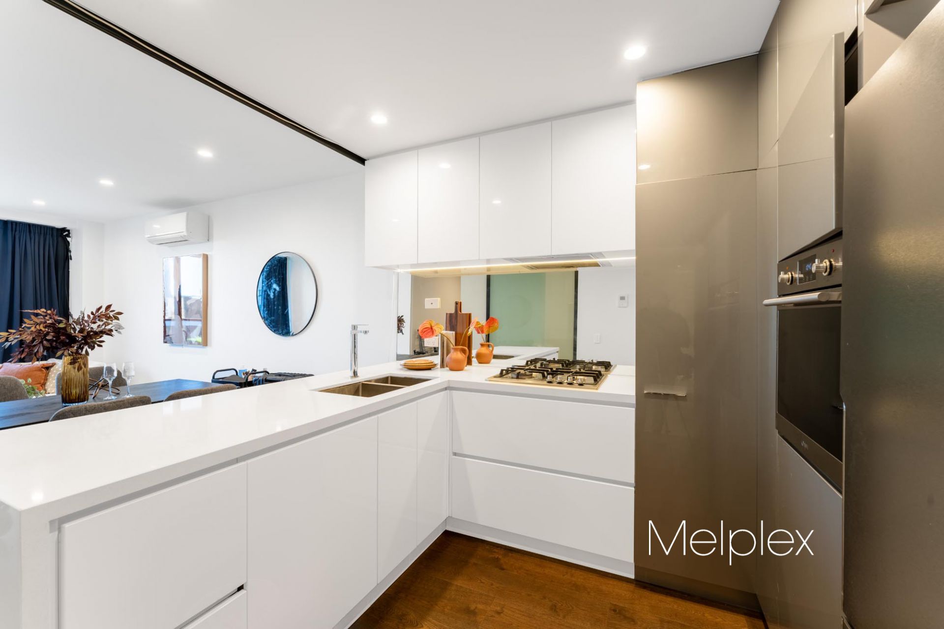 • Sleek designer kitchen with stone benchtops, premium stainless-steel appliances, and ample storage