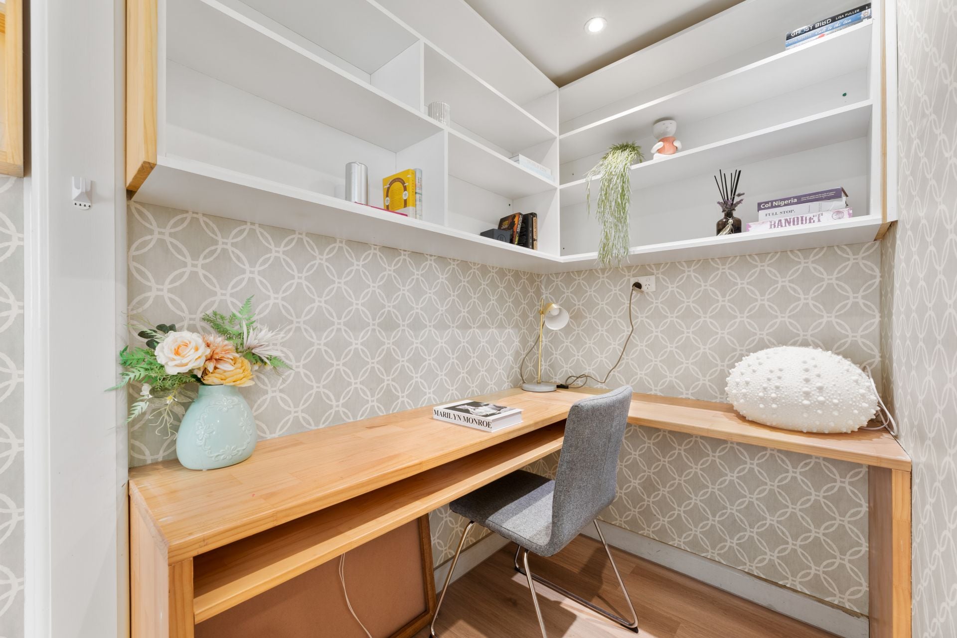 Family accommodation comprises three well-proportioned bedrooms with robes, a separate study with built-in desk and shelving, a modern twin-vanity bathroom with toilet, plus a second bathroom incorporating laundry facilities.